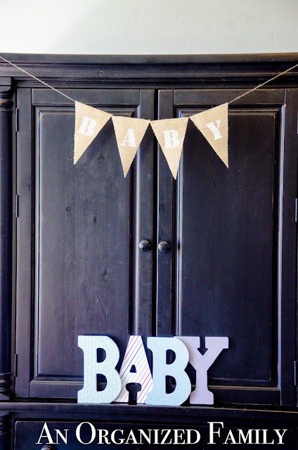 The other day, when I was making my Easter Burlap Banner, I made one that said “Baby” for the shower as well.  My aunt got some wood letters, modpodged some cute paper on them, and put them together for another decoration.