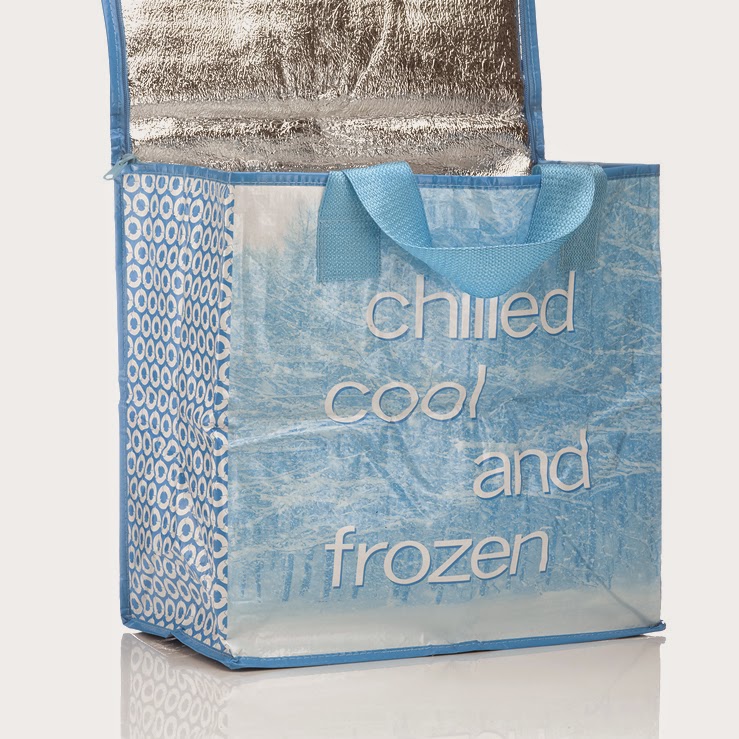 The blue bag is an insulated bag with zipper closure for all of your chilled and frozen items.  And let me tell you, it works! I've used this bag as a cooler on road trips and it has worked wonderfully!  I love to have all of my chilled and frozen items in here and feel secure that they will still be frozen when I get home, even if I have a few detours on the way!