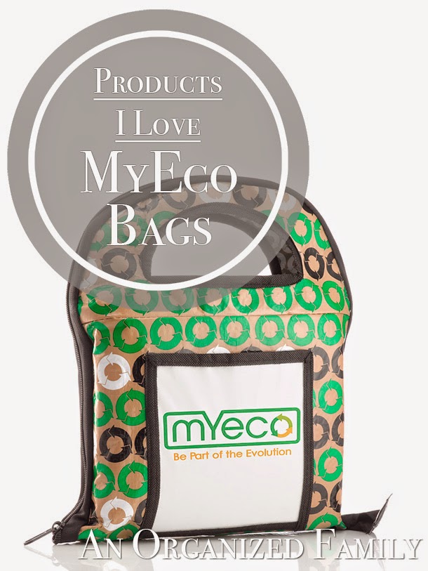 My Eco bags are reusable grocery bags made from recycled yogurt containers.  There are 4 bags and each has a special purpose and is labeled so you know what goes where!  I love that they have large, wide straps that make carrying the bags easier.  They are very sturdy and can hold a lot of weight, and the straps really help evenly distribute that weight.  Even when they are very heavy, I don't ever feel like they are going to break.  The set EASILY replaces 30 disposable plastic sacks, so they are not only made from recycled materials, but very eco-friendly because you are not using disposable sacks.