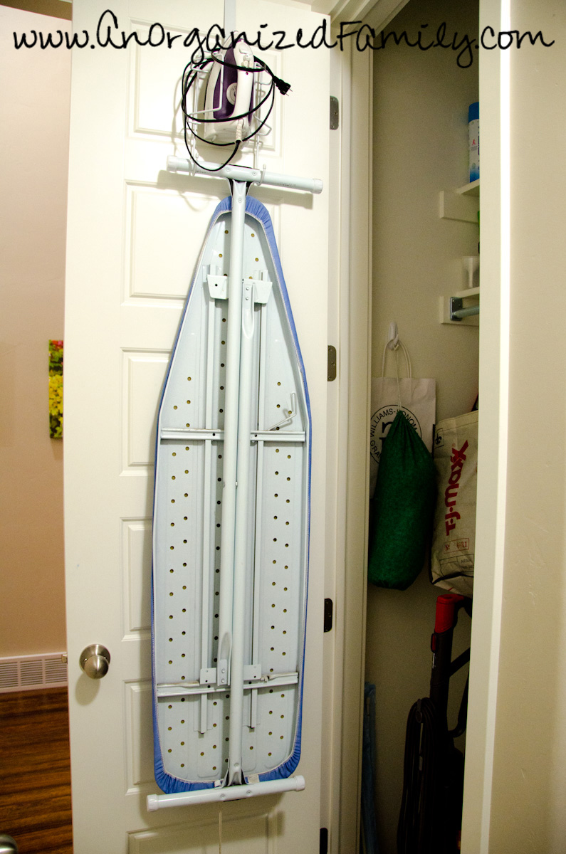 Next is my closet. As you can see, on the door we hang our iron and ironing board. This is great except for the fact that we have 8 ft. doors and so I actually have to get a stool to get the iron down. But...I rarely iron, so I can handle doing that every once in a great while.