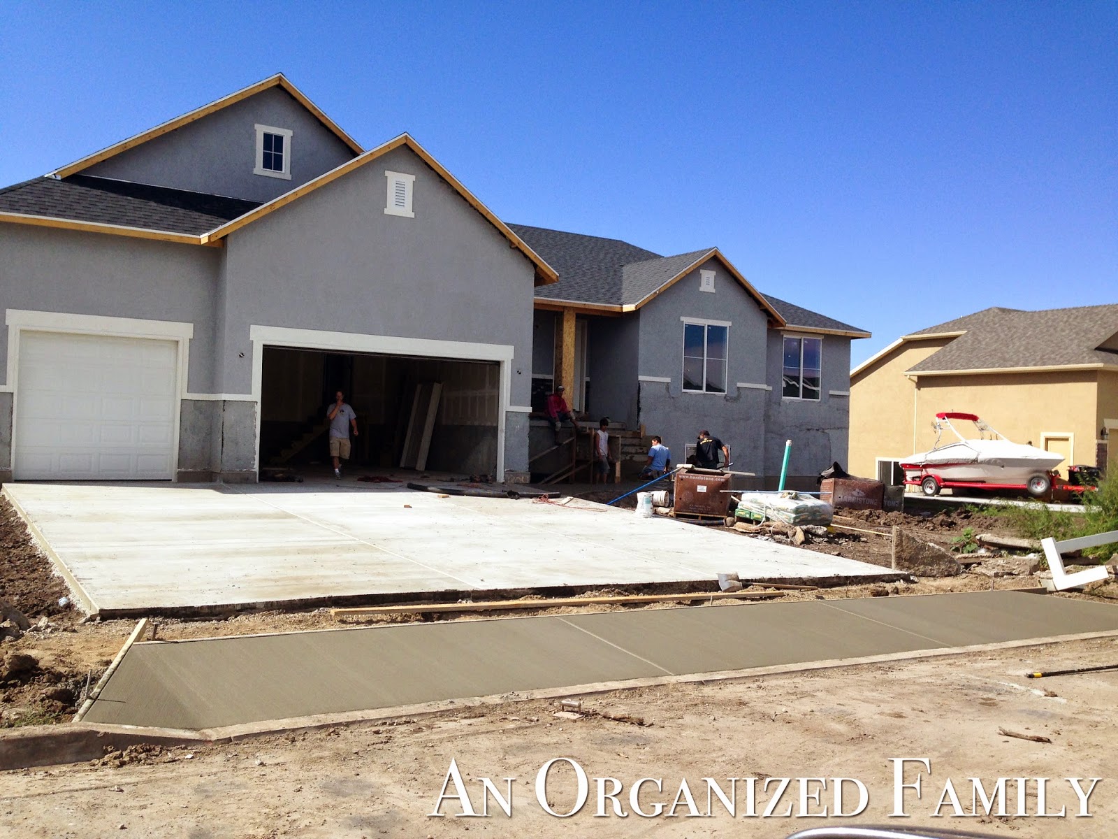 All of our stuff was originally piled up in the middle of the room to make room around the edges for framing. Now that we are done framing and ready to start drywalling the bedrooms and bathroom (the family room will be done later), it was time to move everything again. Last week I spent a couple of days moving all of to the far end of the room in preparation for draping.